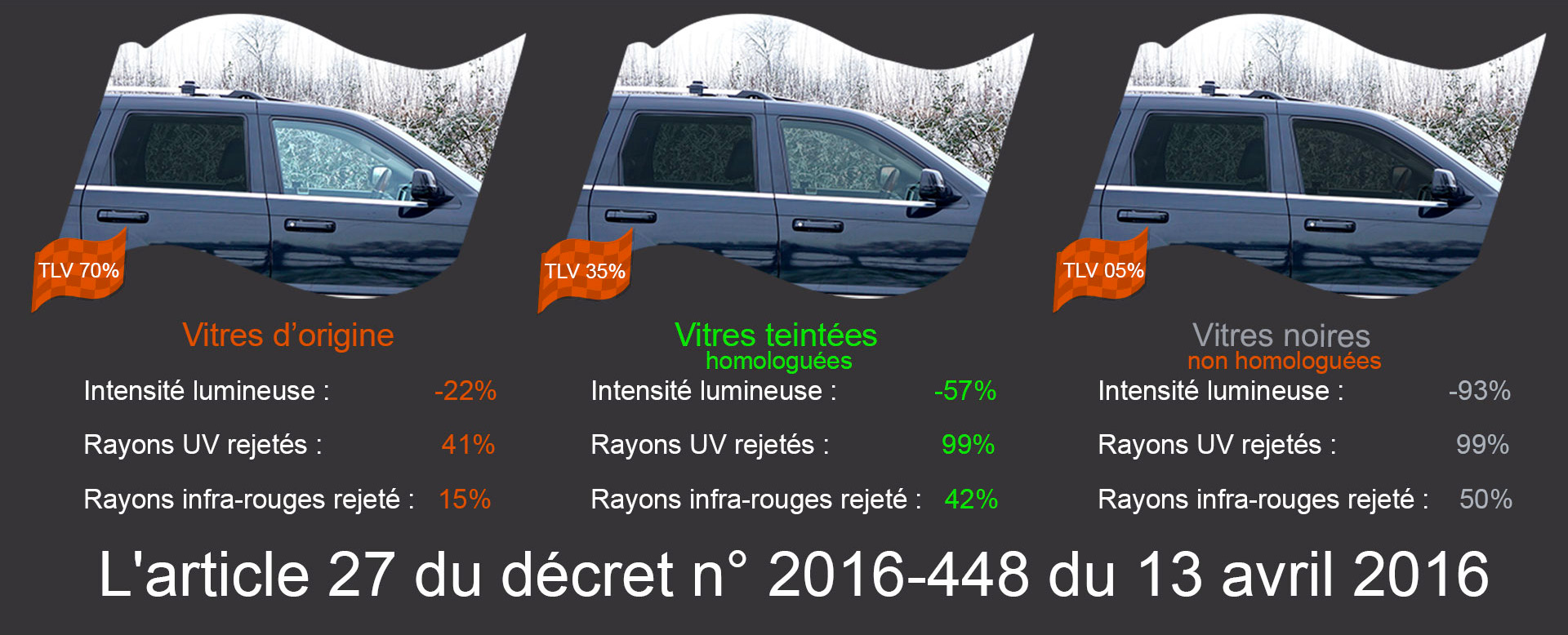 Le 1er janvier 2017, l'article 27 du décret n° 2016-448 du 13 avril 2016 est entré en vigueur. Il interdit les propriétaires de véhicules d'avoir des vitres latérales teintées à l'avant dès lors que leur taux de transparence est inférieur à 70%. Les vitres arrière ne seront par contre pas concernées.